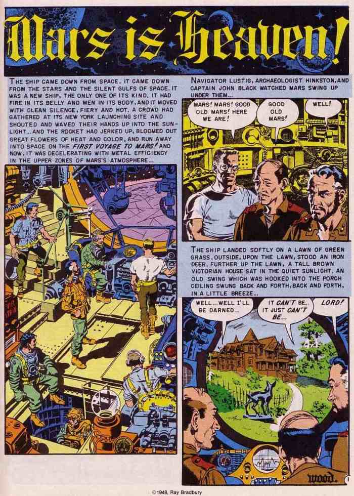 For example: I re-read The Martian Chronicles this weekend, and in the chapter entitled "The Third Mission," which was originally published as “Mars Is Heaven” in 1948, there’s a line that jars like a pothole.  Instead of Martians, the crew of the ship encounters the inhabitants of a middle-America town who all think it’s 1926.  Trying to get his head around this, Captain John Black  says: